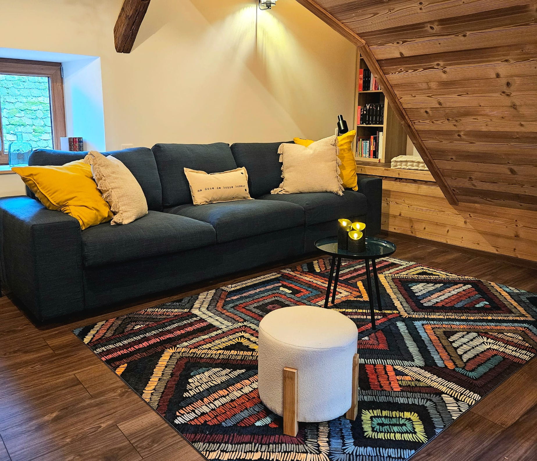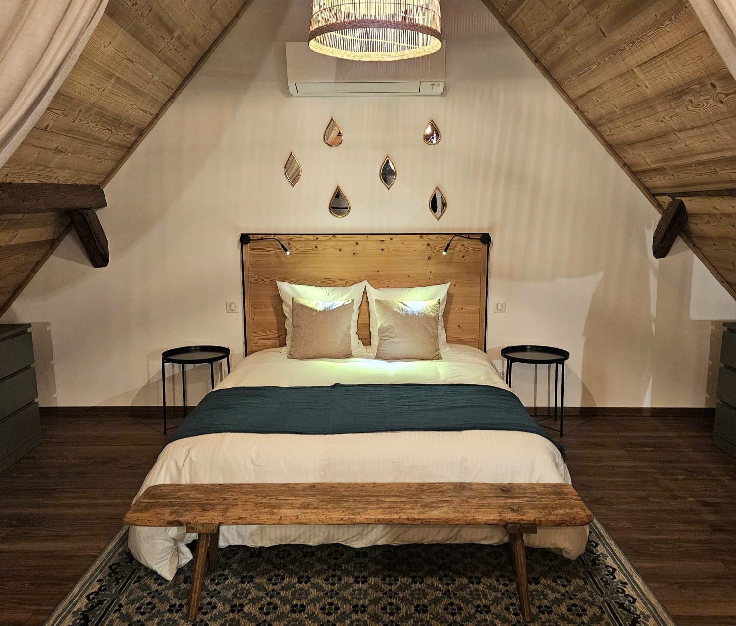 Niché au 2ème étage de la maison, ce spacieux loft de 70 m² offre une ambiance chaleureuse, mariant harmonieusement les poutres apparentes avec une touche de modernité.